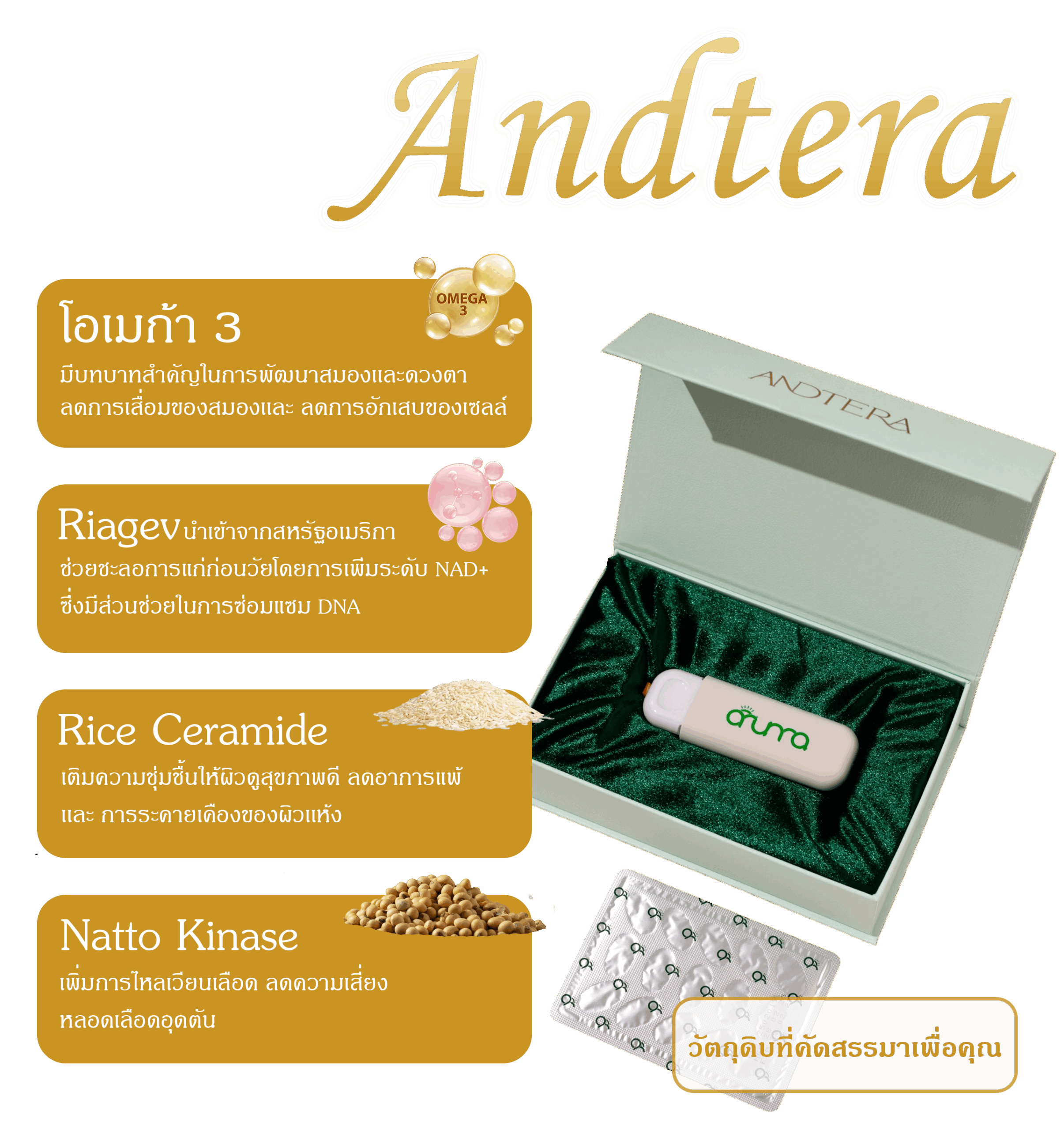 โดยมุ่งดูแลถึงระดับ เทโลเมียร์ (Telomere) ซึ่งเป็นตัวชี้วัดความอ่อนเยาว์ของเซลล์ ช่วยให้เซลล์แข็งแรงและฟื้นฟูได้ดีขึ้น เหมาะสำหรับคนยุคใหม่ที่ใส่ใจสุขภาพ โดยไม่ต้องกินหลายตัว เพราะอาหารเสริมสูตร Andtera กล่องนี้ รับมือทุกปัญหาความชราที่มาก่อนวัย
